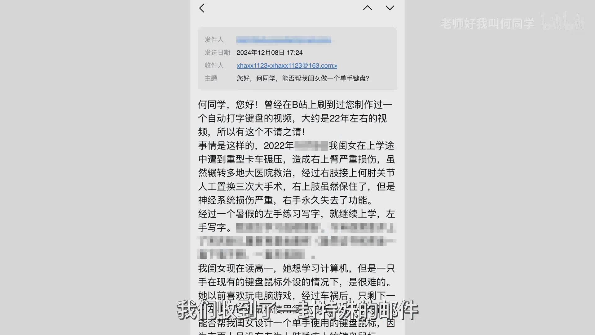 我们收到了一封来自一位父亲的邮件。他的女儿在2022年上学途中不幸遭遇重型卡车碾压,虽然经过多次手术保住了左手,但右手永久失去了功能。女孩想学习计算机,但在单手使用标准键盘和鼠标时遇到了极大的困难,需要在两者之间频繁移动,打字缓慢且费力。父亲看到我们之前的视频,希望能为女儿设计一个单手使用的键盘鼠标,并附上了一张他自己画的草图。
