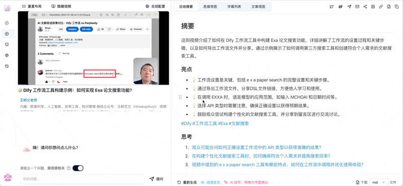 修复YouTube视频总结功能 我们很高兴地宣布,之前存在的YouTube视频总结问题已经得到解决。现在,用户可以正常使用BibiGPT来总结YouTube视频,享受流畅的视频内容分析体验。这一修复大大提升了我们对YouTube平台的支持,让用户能够更便捷地获取视频核心信息。