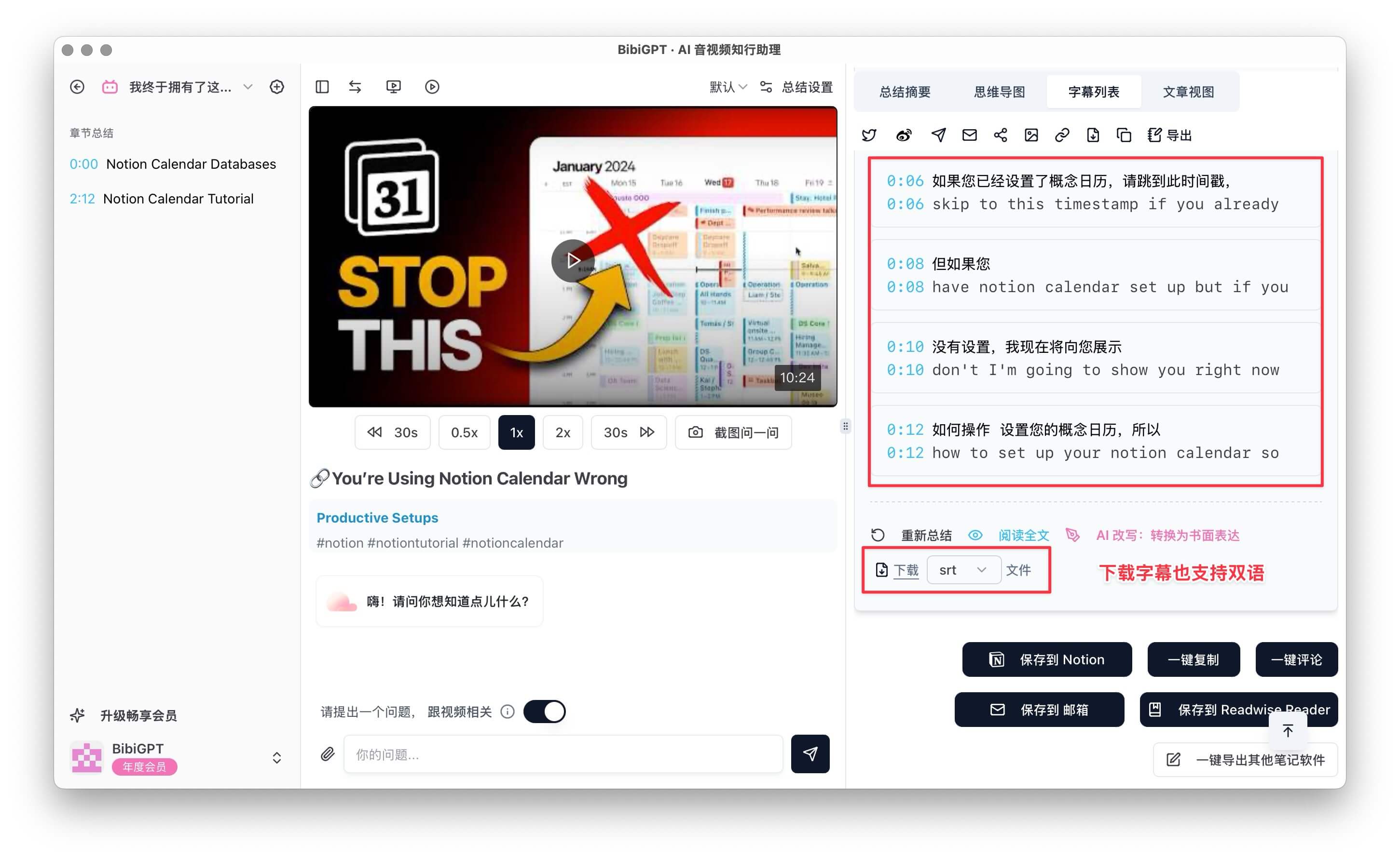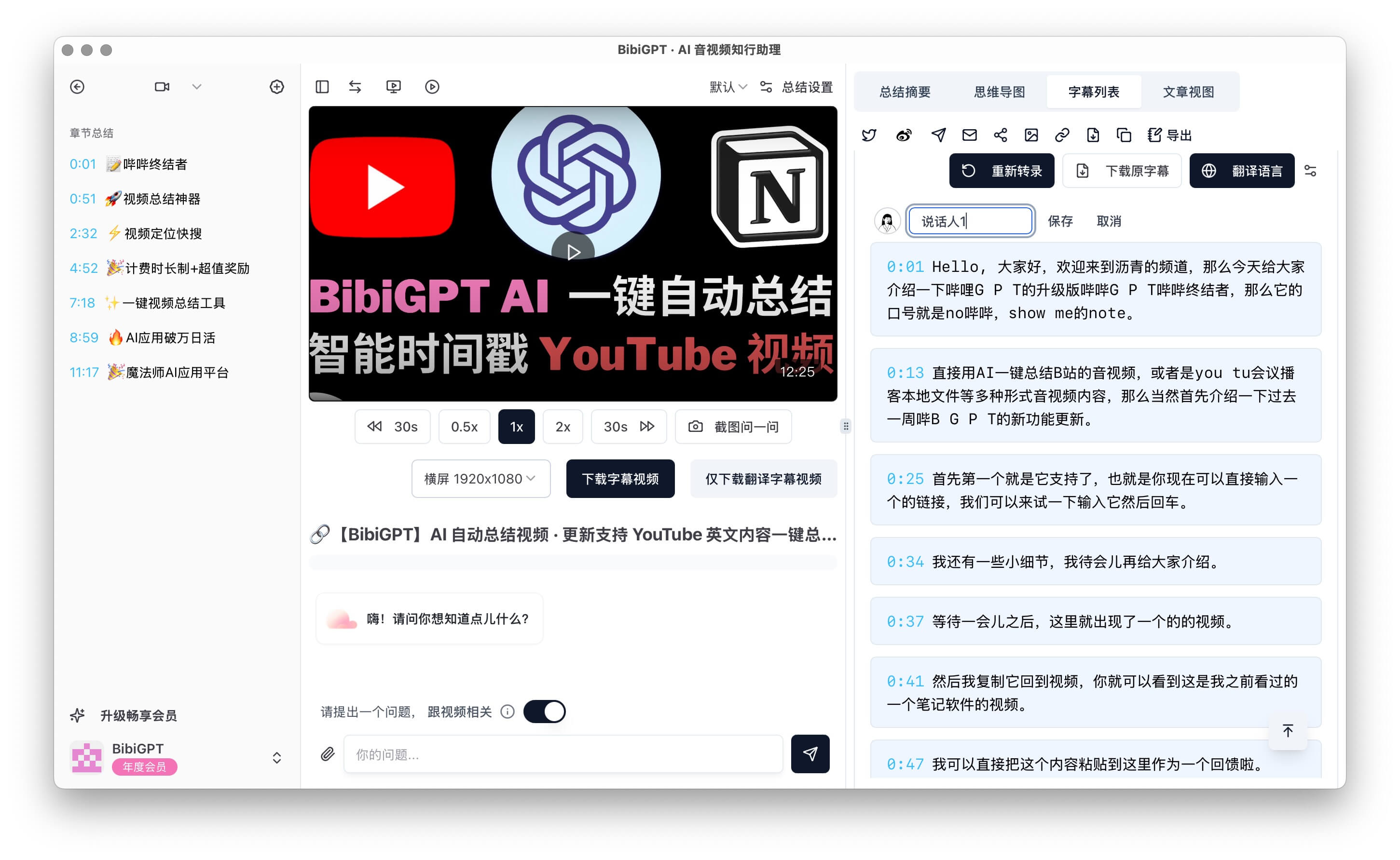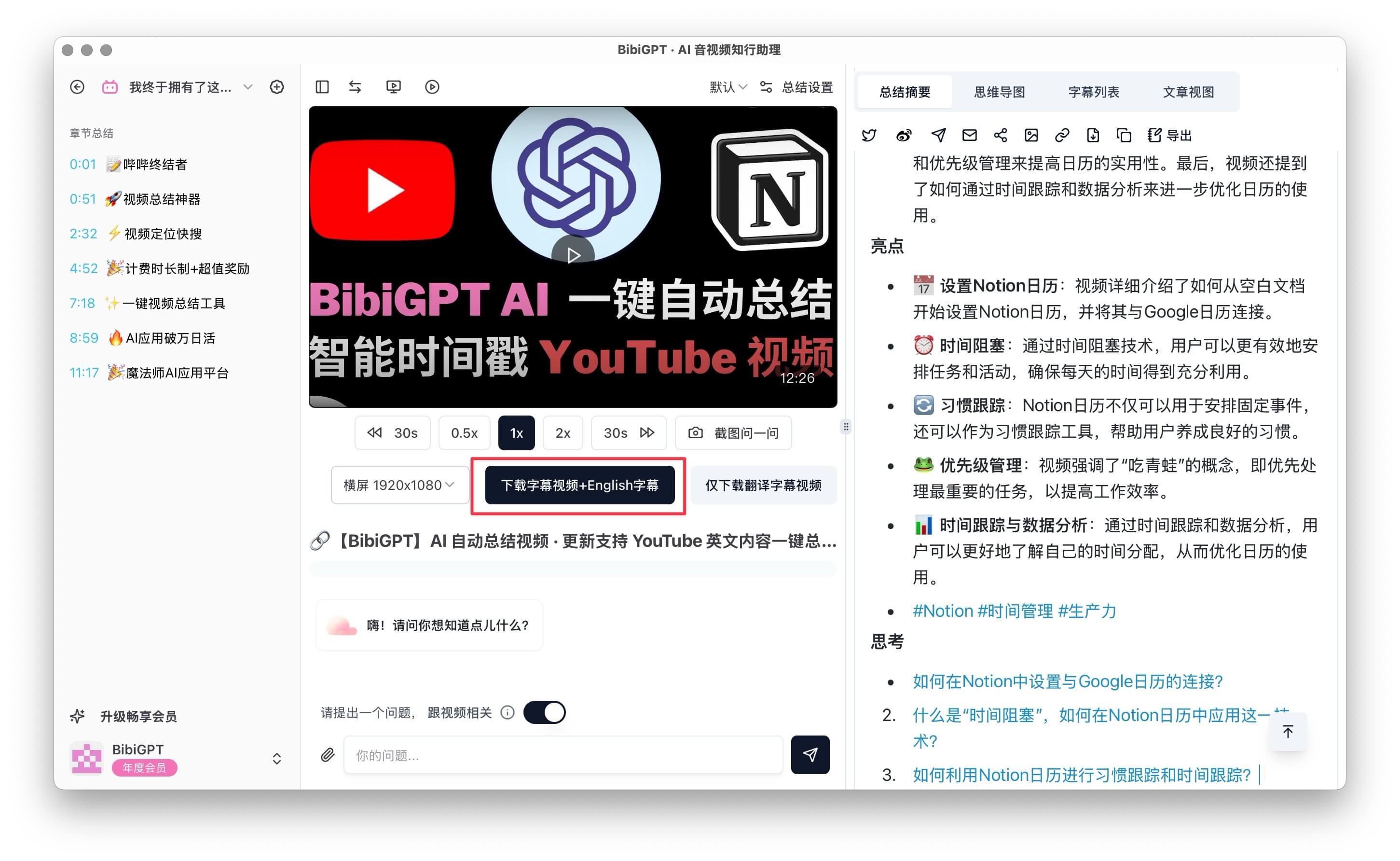 通过BibiGPT本地客户端,轻松下载带字幕的视频文件。您可以通过访问 BibiGPT客户端下载页面 下载最新版本。
