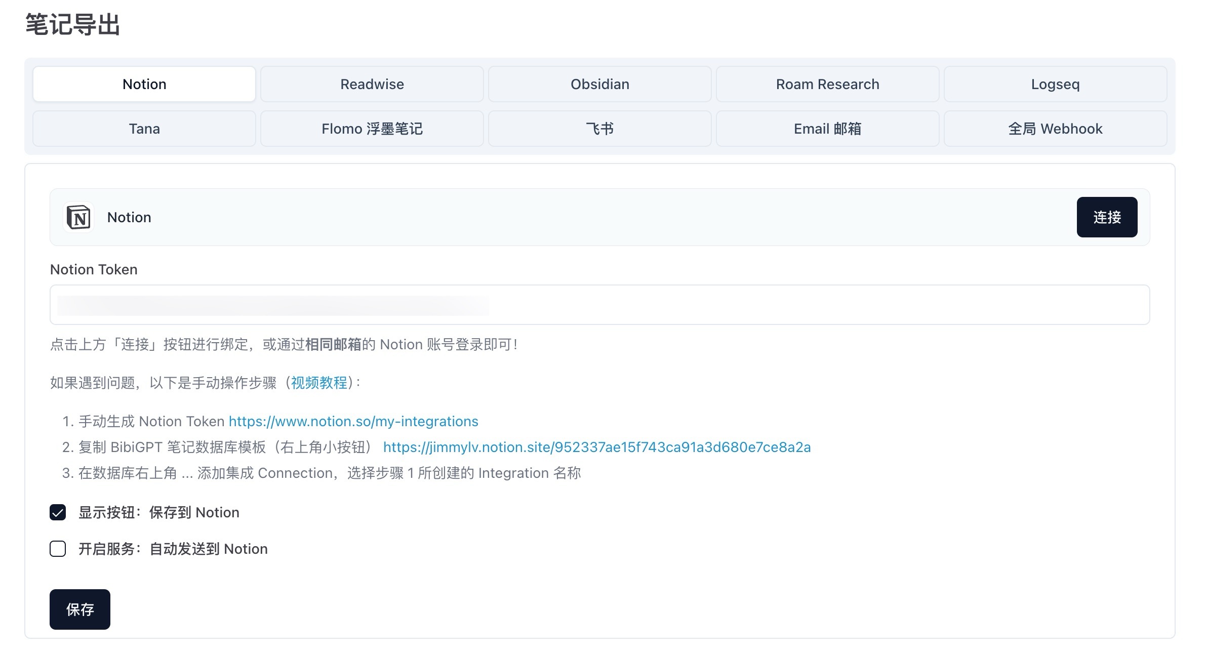 要开始使用这套AI驱动的学习系统,首先需要完成BibiGPT与Notion的账号关联。我们提供两种便捷的配置方式: