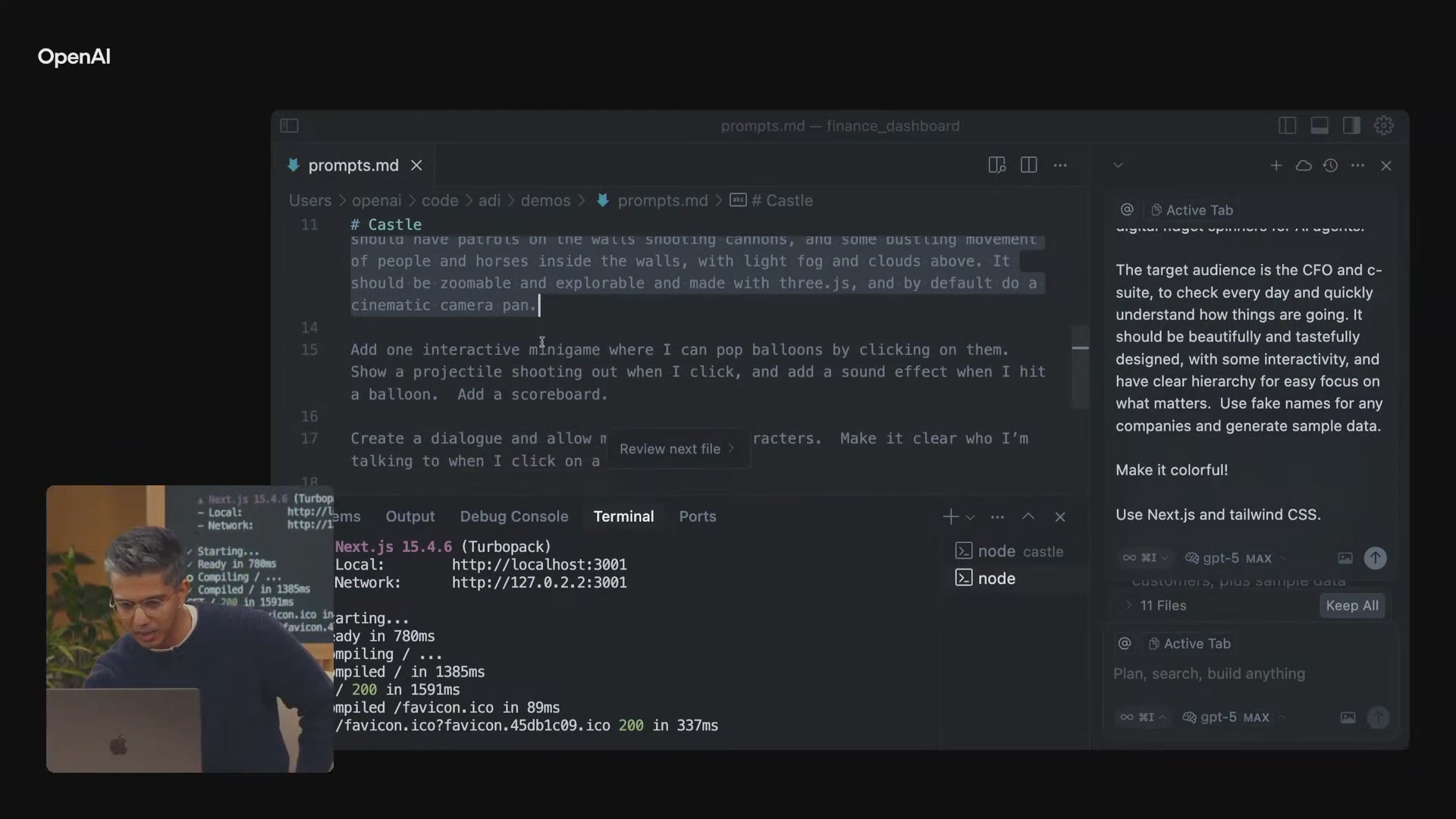 为了进一步挑战GPT-5的创造力,演示者提出了一个更有趣的需求:制作一个3D游戏。在提示词中详细描述了一个富有想象力的场景:一座坐落在山顶上的、史诗般的童话城堡,城墙上有巡逻的卫兵和发射炮弹的大炮,城内有马匹和人群,天空中飘着薄雾和云彩。